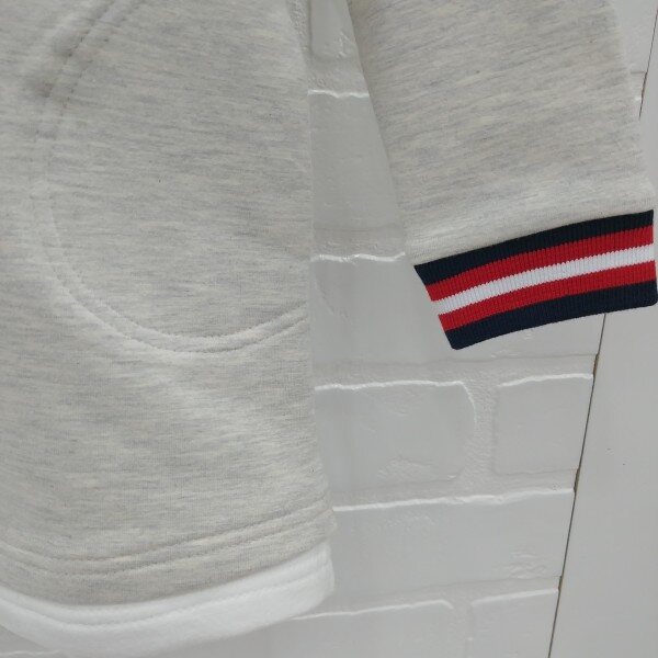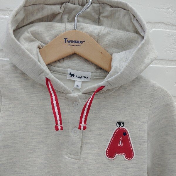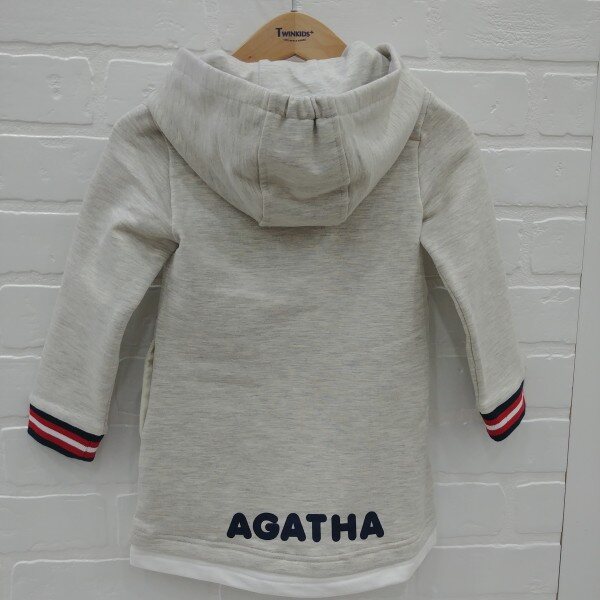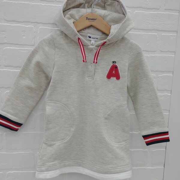 따뜻한 기모 져지 스판 소재의 롱기장의 후드티셔츠, 레이어드해 입은듯한 디자인과 배색 요꼬시보리와 아플리케 자수 뒤 레터링 나염으로 포인트를줌.