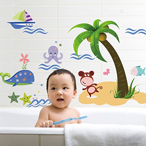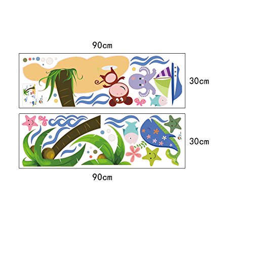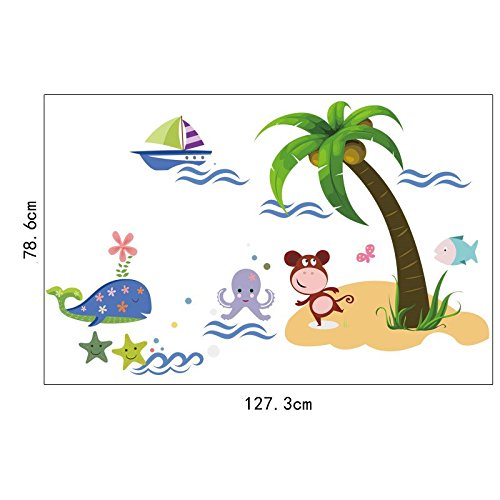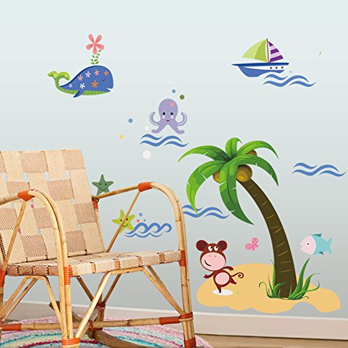 WallDecalArt DIY Animal Zoo Monkey Whale Fish under the Coco Tree Lovely Cartoon Sea Ocean Nursery Room Wall Decal Babyroom Wall Sticker