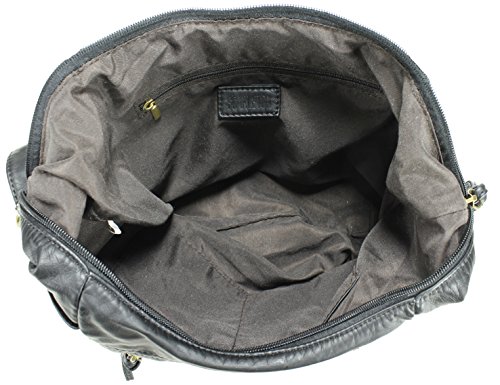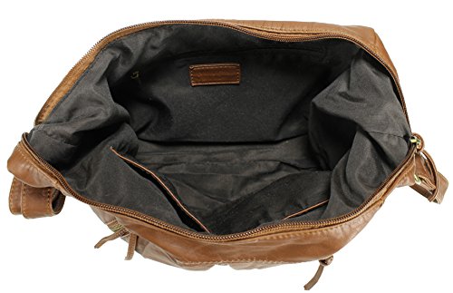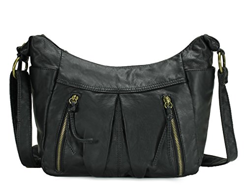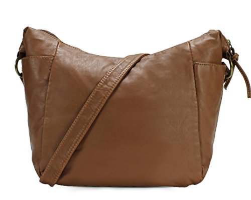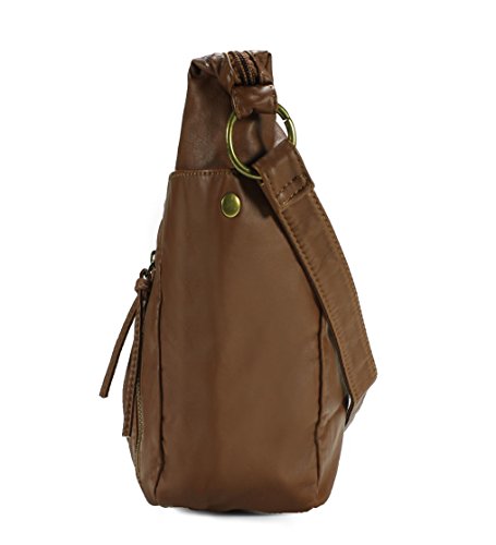 -. Feature : High quality synthetic washed leather with fabric lining. / Classic bronze-toned hardware. Two front zipper pockets. / Interior cell phone pocket, multifunctional slip and side zipper pocket. / Adjustable shoulder strap drops 24". / Size: 9.3"x8.8"x3.8"