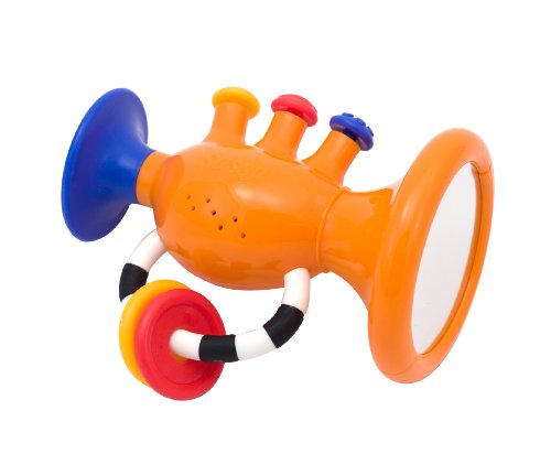 The Sassy Trumpet Tunes give baby fun music play that she can dance to! Plus, both English and Spanish words introduce baby to the cadence of language. There are a variety of sounds attracting attention through senses of hearing. When each key is pushed, the color is said in English and Spanish. This action helps baby develop tactile sensitivity and tach a lesson in cause and effect as baby is rewarded with sounds. Lastly, the large mirror inside the trumpet engages vision and allows baby to see herself.Feature