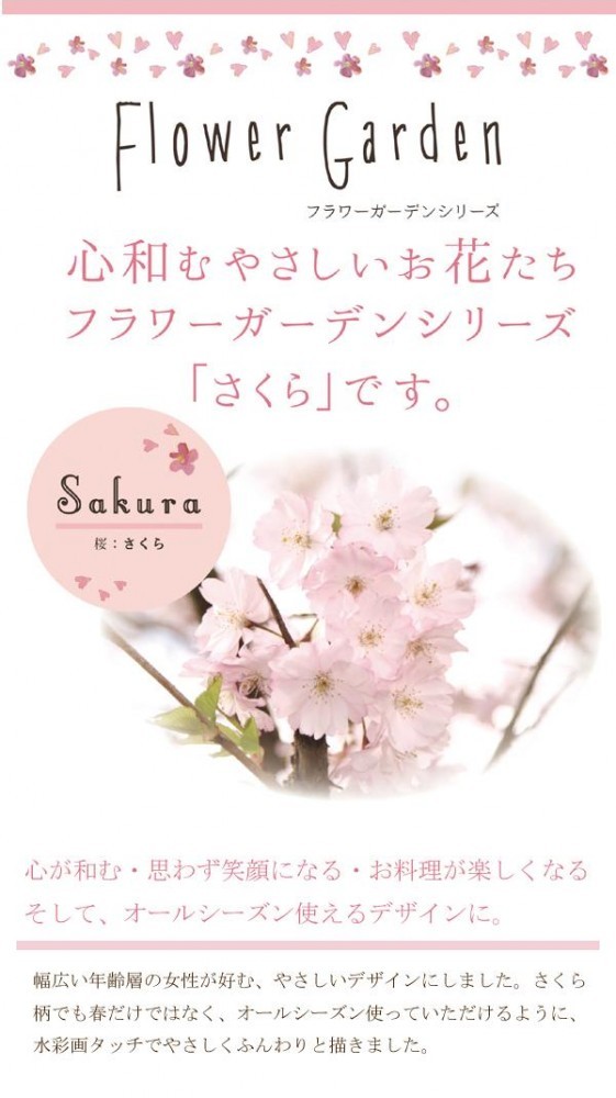 | 幅広い年齢層の女性が好む、やさしいデザインにしました。さくら柄でも春だけではなく、オールシーズン使っていただけるように、水彩画タッチでやさしくふんわりと描きました。 |