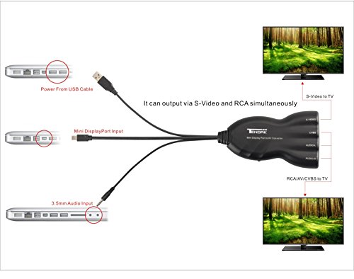 Studio : ztendak Publisher : ztendak Binding : Electronics Product Description Tendak Mini DisplayPort to Composite Video and S-Video Converter allows high resolution device with DisplayPort interface to be displayed on CRT/LCD TV. It supports high-quality video up to DVD level and above. It is widely used for business presentations, multimedia and computer games etc. It is Plug-and- play, and no software is needed. Zoom Function: Adjust the aspect ratio if the image is too large or too small on the TV. Specification: Input: 1 x Mini DisplayPort, 1 x USB , 1 x 3.5mm Audio Output: 1 x Composite Video, 1 x S-Video DisplayPort resolution: 640x480(60Hz); 800x600(60Hz); 1024x768(60Hz); 1024x768(60Hz); 1280x720 (60Hz); 1280x1024(60Hz) Support TV system: NTSC Output level: CVBS (1.0Vpp);S-Video(Y: 1.0Vpp, C: 0.3Vpp); Output Resistance: 75 Om; Power Supplier: DC5V; Size: 40cm Mini DisplayPort cable; 41cm USB cable; 42cm audio cable Product Dimension: 130x75x27mm (L x W x H) Package Contents: 1 x Mini DisplayPort to AV Converter 1 x 1.5m AV Cable 1 x 1.5m S-Video Cable Note: It does not output in the opposite direction. Warranty: 1 Year Limited Warranty by Tendak 0