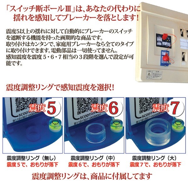 【商品名】ブレーカー自動遮断装置 「スイッチ断ボール3」 キャップ5種/水平器付き 日本製