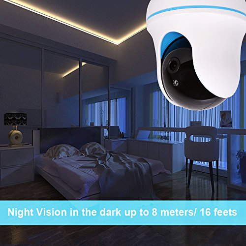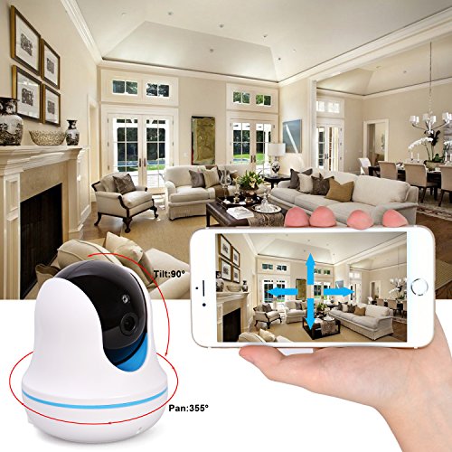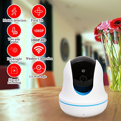 -. Feature : ► FULL 1080P HD VIDEO CAMERA - High-definition with 1920*1080P resolution at 25fps, 112° wide-angle advanced glass lens combined with 355° horizontal and 90° vertical rotation range create a complete 360° coverage. Advanced night vision to viewi distance to 8 meters/26 feets in pitch dark with no light pollution, so your baby or pet will not be disturbed by LED glare. / ► CLEAR TWO-WAY AUDIO Responsive and advanced microphone with a built-in anti-noise filter for a clear 2-way Audio experience. Intercom Mode: one party to talk and listen at a time or Hands-free Mode: both parties talk and listen freely for maximum flexibility. / ► NIGHT VISION UP TO 26 FEET: Remotely talk and listen via mobile App even in the dark with the IR LED night vision up to 26 feet.So you can keep in touch with your baby when you miss him and want to talk to him. This home security camera gives you wonderful night experience even in dark and full protection to see the whole room at night. It also can be used for shops, meeting room, pets,nanny, elder monitor. / ► USER-FRIENDLY AND INTUITIVE APP - Motion Dection Alarm and I/O Akarn, Mail setting, FTP setting, Camera setting, Wifi setting, Supports connectivity to a large number of devices with the same app/account for maximum convenience. Available for iOS and Android. / ► RELIABLE 2.4G WIFI CONNECTION - Quick WiFi setup via mobile App "P2PWIFICAM" on iPhone or Android smartphone. Reliable Wi-Fi connectivity to access your camera with P2PWIFICAM App on mobile device or PC at anytime and anywhere. Built-in support for 802.11b/g/n 2.4Ghz Wi-Fi band.