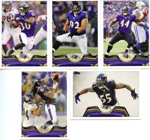 Baltimore Ravens 2013 Topps complete hand collated regular issue 14 card team set including a Super Bowl XLVII Champions card, Joe Flacco, Vonta Leach, Ray Rice, Haloti Ngata, Bernard Pierce, Terrell Suggs, Torrey Smith, Arthur Brown, Dennis Pitta, Matt Elam, Elvis Dumervil, Jacoby Jones and a Baltimore Ravens Team Card.