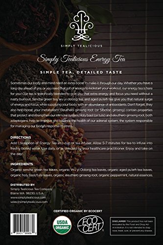 -. Binding : Health and Beauty -. Brand : Simply Tealicious -. Color : Multiple -. EAN : 0636431999882 -. Feature : BEST WEIGHT LOSS TEA + GENTLE TEA DETOX - Our tea is uniquely blended to enhance your energy levels, workout, or weight loss experience with our delicious, functional ingredients. Boosts metabolism, suppresses appetite, reduces cravings, aids in digestion, and reduces bloating / ENHANCE YOUR WEIGHT LOSS PROGRESS - Sencha green tea speeds up metabolism & reduces mindless snacking by stabilizing blood glucose levels; thus, acting as mild appetite suppressant. Wu Yi oolong tea boosts metabolism, prevents fat storage, & promotes healthy fat burning. Pu'erh boosts metabolism, lowers bad cholesterol, aids in digestion, & balances blood glucose levels. Eleuthero Ginseng Root helps to stabilize blood glucose levels helping to control cravings & suppresses the appetite / NATURAL ENERGY & ENDURANCE WITHOUT A NASTY BURNOUT - Sencha green tea, Wu Yi oolong, and Pu'erh jumpstarts your metabolism and boosts your energy levels giving you the focus and concentration. Holy Basil (Tulsi)i and Eleuthero Ginseng Root strengthen the body's response to stress and fatigue giving you more endurance through the day. Say goodbye to the unwanted 'crashes' or 'burnouts' as seen from other energy beverages / STRENGTHENS & PROTECTS - Our energy tea not only helps improve the body's response to stress but it also helps to strengthen and protect your immune system with continued use. With a rich array of antioxidants and protective properties from our superb ingredients, you will be tackling the day while nourishing your body / 100% CERTIFIED ORGANIC INGREDIENTS - All our ingredients are certified organic by Ecocert USA and Ecocert Canada: Sencha Green Tea, Wu Yi Oolong, Pu'erh, Holy Basil/Tulsi, Eleuthero Ginseng, & Peppermint. Quality is very important to our brand. There are no harmful toxins, additives, fillers, or 'artificial' flavourings -. IsAdultProduct : 0 -. PackageQuantity : 1 -. ProductGroup : Health and Beauty -. ProductTypeName : HEALTH_PERSONAL_CARE -. Title : THE BEST ORGANIC WEIGHT LOSS TEA - Gentle Detox, Boosts Metabolism, Appetite Suppressant, Craving Control, & Reduces Bloating. Made with 100% Certified Organic Ingredients - Green Tea, Oolong Tea, White Tea, Pu erh Tea, Ginseng, and Peppermint -. UPC : 636431999882