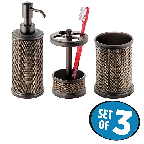 mDesign Bath Accessory Set, Soap Dispenser Pump, Toothbrush Holder, Tumbler - 3 Pieces, Bronze