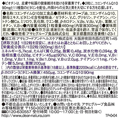 栄養成分 : 1日目安量2粒 ・コエンザイムQ10 90mg /V.C 80mg /V.E 8mg /V.B1 1.0mg /V.B2 1.1mg V.B6 1.0mg / V.B12 2μg / ビオチン 45μg / パントテン酸 5.5mg / ナイアシン 11mg 葉酸 200μg/ β-カロテン 5.4mg