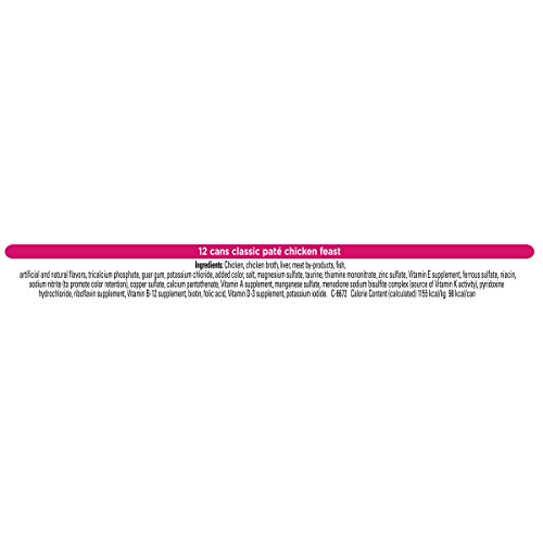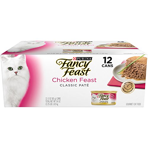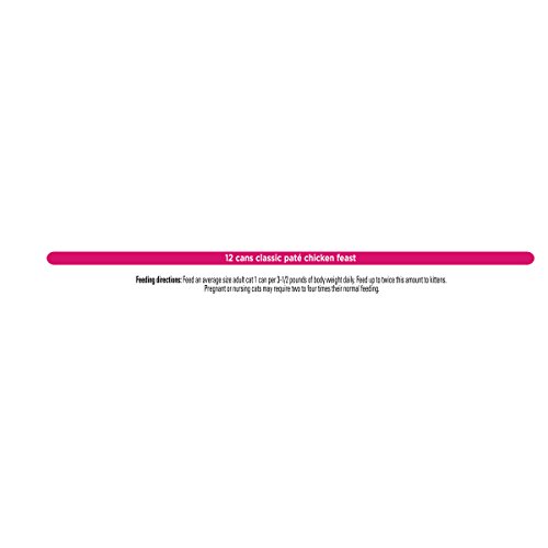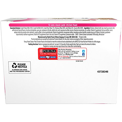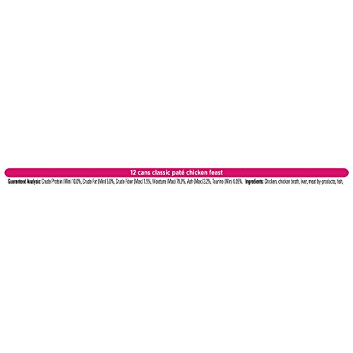 Make mealtime a rewarding experience for your pampered feline by feeding her Purina Fancy Feast Classic Chicken Feast Collection wet cat food. Backed by a company known for pet nutrition, this tender gourmet wet cat food fuels her desire for rich poultry flavor while keeping you confident that she's getting the best in nutrition to support her active lifestyle. Because we know that your choosy kitty has a discerning palate, we make chicken the first ingredient in this delectable 100% complete and balanced cat food, giving her something she can look forward to each time she hears the seal pop on the can. The fine pate texture makes this delicious premium wet cat food easy to chew, ensuring that even the last morsel is appreciated and mealtime always ends with an empty bowl. Each serving also contains the vitamins and minerals your cat needs to promote optimal health, so she can live her life with you to the fullest. Crude Protein (Min)...10.0%, Crude Fat (Min)...5.0%, Crude Fiber (Max)...1.5%, Moisture (Max)...78.0%, Ash (Max)...3.2%, Taurine (Min)...0.05%.