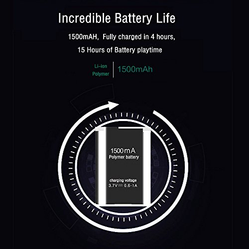 Portable under 16 ounces, 5 inches long, 9 inches tall; High capacity rechargeable 1500 mAh battery for up to 15 hours of playtime at 2/3 volume on a full charge; designed to be comfortable to carry with no square edges, super light and easy to fit in your backpack, baggage