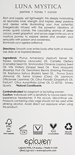 Rich and supple, yet lightweight, this deeply moisturizing oil resonates inner strength and inspires deep passions and desires while illuminating your true potential. Energetically infused with the powerful vibrations of smoky quartz crystals, the cascading aromas of deep cocoa, sweet grapefruit, and savory sage invite you on a mystical journey to explore desires and awaken your sensuality with passion and awareness. Illuminate your ageless brilliance with this nourishing body fragrance.Feature