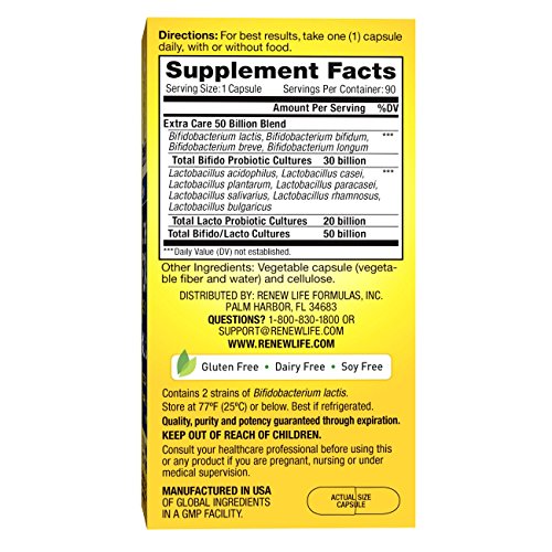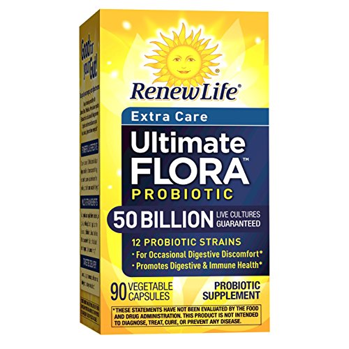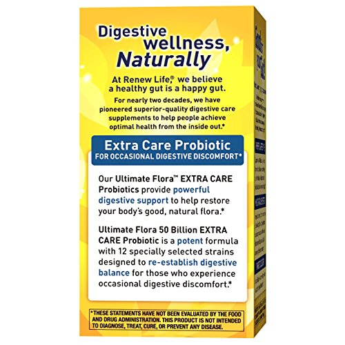 Renew Life Ultimate Flora Extra Care Probiotic 50 Billion is a potent formula with 12 specially selected Bifidobacterium and Lactobacillus strains designed to re-establish digestive balance for those who experience occasional digestive discomfort.* When taken regularly, it also helps promote digestive and immune health so you feel better, lighter, and more energized.* These statements have not been evaluated by the Food and Drug Administration. This product is not intended to diagnose, treat, cure, or prevent any disease.Feature