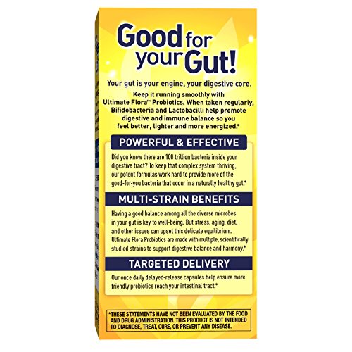 Ultimate Flora Extra Care Probiotic 50 Billion is a high-potency formula with 10 scientifically studied Bifidobacterium and Lactobacillus strains designed to re-establish digestive balance for those who experience occasional digestive discomfort. When taken regularly, it also helps promote digestive and immune health so you feel better, lighter, and more energized.