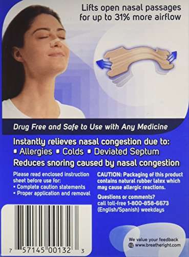 Nasal congestion (or a blocked nose) can make you breathe through your mouth instead of your nose which may cause snoring and a bad night’s sleep for you and your partner. Breathe Right Nasal Strips gently open your nasal passages helping you to breathe better by providing temporary relief from nasal congestion and stuffiness which can be caused by colds and allergies. Each drug-free nasal strip consists of flexible “spring-like” bands that when placed correctly across the nose, gently opens the nasal passages to make breathing easier.Feature