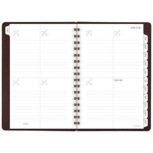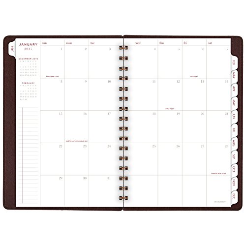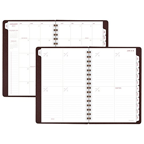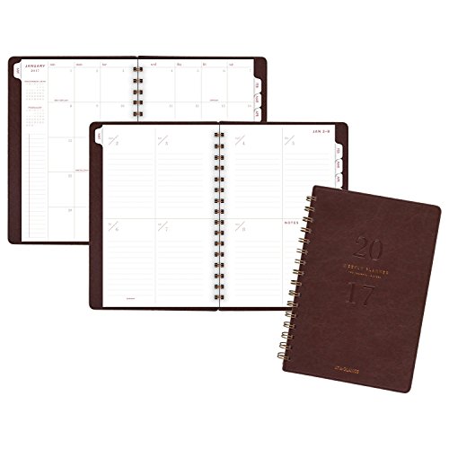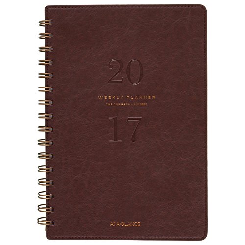 -. Feature : Deluxe covers of the 2017 weekly / monthly planner house 13 months of dated planning pages from January - January; warm brown, leatherlike covers are twinwire bound with bronze wire for a designer finish; 5-3/4" x 8-1/2" page size / 1 week per 2 page spread is spacious with ruled writing areas for each day; 1 month per 2 page spread is tabbed to easily find any date in the planner; past and future month calendar blocks for reference, plus additional notes space included throughout / Special pages included: holiday listing, 3 year reference calendars, event calendar, contacts pages and notes pages; double-sided clear pocket provides convenient storage for loose sheets / P.R.Inted on quality paper containing a minimum of 60% post-consumer waste recycled material; part of the AT-A-GLANCE Collection line of products; mix and match with other items from the line to meet all your planning and organizing needs