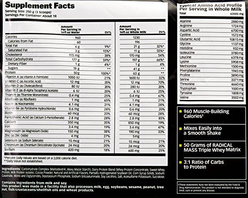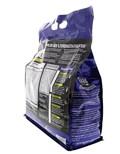 ReleaseDate : 2016-04-20 Studio : GAT Publisher : GAT Binding : Health and Beauty Product Description In each of GAT Radical Mass's 250g servings you get 50g of protein from whey concentrate, sweet whey protein and milk protein isolate. 177g of carbohydrates (19g sugar, 1g fiber) from maltodextrin and waxy maize, 6g of fat (3g saturated), and a calorie total of just under 1,000 at exactly 960. You can see the full Radical Mass label below, although it is from a sample sachet so the numbers on the left are based on a quarter serving then on the right you have the amounts in a full 250g serving. 0