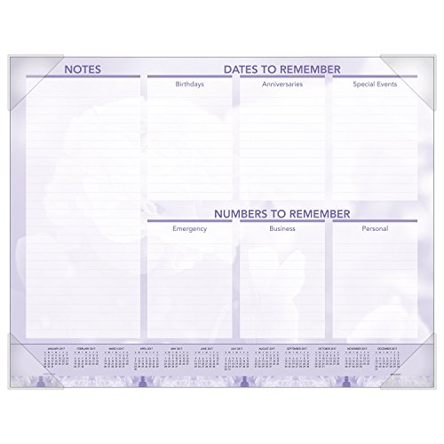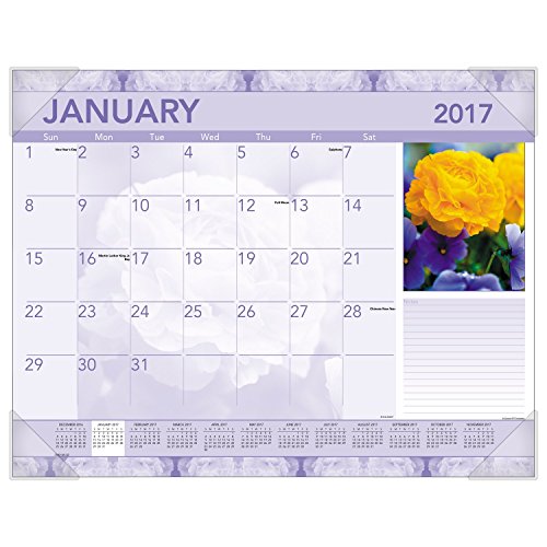 -. Feature : Monthly desk pad is the perfect visual planner to display on your desk top. 12 month date range runs from January - December, with a different striking floral image is displayed each month, sure to brighten your work space. / Desk pad displays one month at a time with a lined note taking area under the floral image, plenty of writing space on each page for your notes, appointments and deadlines / 2.19 in. x 2.19 in. daily blocks are unruled to allow space for your notes / Full year calendar is at the bottom of each page for fast future date reference and includes bonus pages with current and future yearly reference calendars and dates to remember page for long range planning / Desk pad has four poly corners and the paper made from 30% post-consumer waste recycled material. Page size 22 in. x 17 in. Overall size 22.063 in. x 17.13 in.13 in.