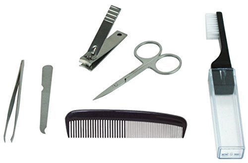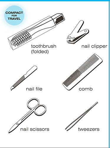 - 6 PIECE SET INCLUDES PURE ESSENTIALS AND BEST ACCESSORIES TOOLS KIT THAT ONE MUST HAVE FOR USE ANYTIME, ANYWHERE. Cordless and non electric tools included in the tool set are a toothbrush that stores in its own closed plastic cover to remain clean and hygienic, a hair com to brush your hair, stainless steel nail clipper to be used as a nails trimmer or groom you hand, toenails, foot nails, a nail file, a scissor to trim and cut your face beard facial hair, and a tweezer to for eyebrows.