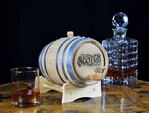 Laser inscribed handcrafted American White Oak ReCoop ® Barrel with 'Scotch' design. This barrel is manufactured from premium bourbon barrels made in the USA, has a medium char and comes with the stand, bung, wooden spigot and storing tablet. ? Perfect for aging Wine, Beer, Tequila, Brandy, Whiskey, Scotch, Bourbon, Rum, Cognac or any spirit that benefits from aging. Because of natural variations of wood, the overall appearance of the inscription will vary slightly. ? Available in 2, 3, 5, 10 and 20 liter sizes. ? Dimensions: 1 Liter 6.5' x 4.5' x 4.5' inches 2 Liter 7.5' x 5' x 5' inches 3 Liter 8.5' x 5.5' x 5.5' inches 5 Liter 9.5' x 6.5' x 6.5' inches 10 Liter 12' x 8' x 8' inches 20 Liter 15' x 10.5' x 10.5' inches Char: Medium Hoops: 4-6 hoops Accessories: - Laser Inscribed design