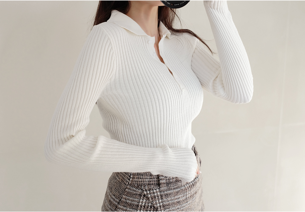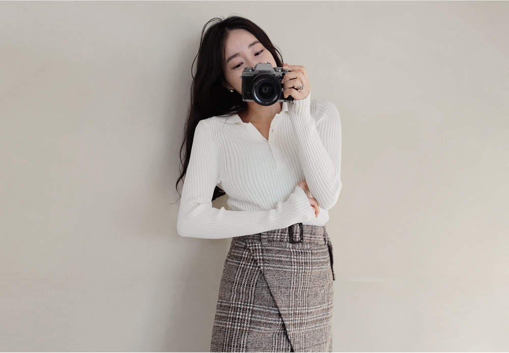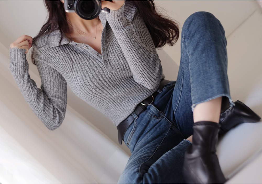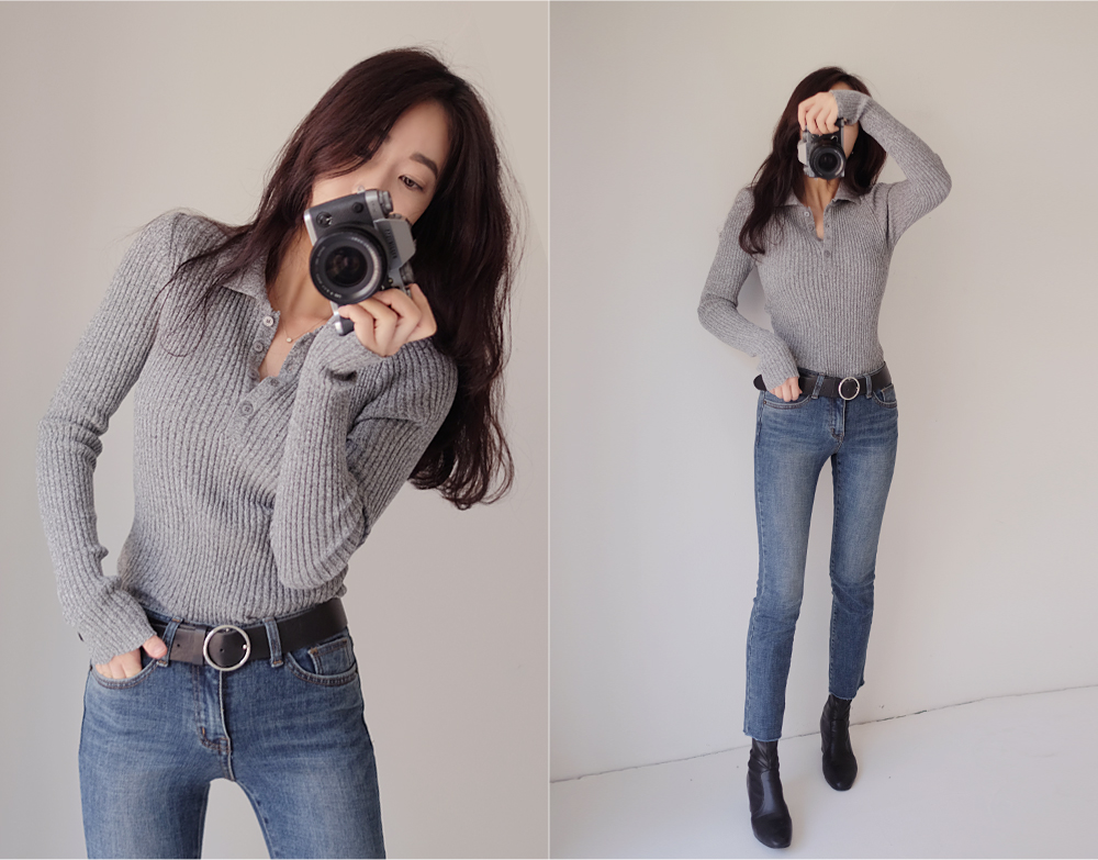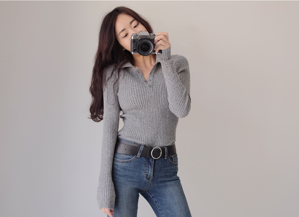탄력좋은 소재감으로 슬림한 핏을 연출해주는 니트티셔츠에요.