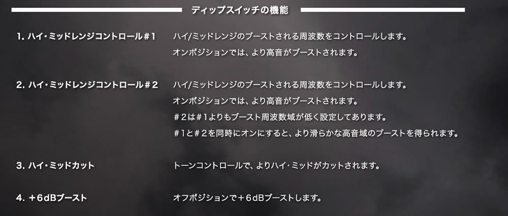 With the built-in dip switch, you can select bright gain with Super Gray Super Lead setting, thick warm Super Bass, and two other tone characters.