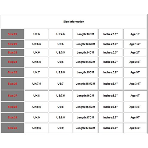 Studio : DDFL Publisher : DDFL Binding : Baby Product Product Description 100% Brand new and high quality Sole material:Rubber sole Material of shoes:Patent leather Soft material makes baby feel very comfortable Prefect for Winter daily use and easy to take off or wear Anti-slip design keeps baby in safe Great gift to baby Gender:Girls Pattern Type:Fight color Package content:1 pair shoes Size:21 --- UK:5 --- US:4.5 --- Length:13.5CM --- Inches:5.3" --- Age:1T Size:22 --- UK:5.5 --- US:5 --- Length:14CM --- Inches:5.5" --- Age:1.5T Size:23 --- UK:6 --- US:5.5 --- Length:14.5CM--- Inches:5.7" --- Age:2T Size:24 --- UK:6.5 --- US:6 --- Length:15CM --- Inches:5.9" --- Age:2.5T Size:25 --- UK:7 --- US:6.5 --- Length:15.5CM--- Inches:6.1" --- Age:3T Size:26 --- UK:7.5 --- US:7 --- Length:16.1CM--- Inches:6.3" --- Age:3.5T Size:27 --- UK:8 --- US:7.5 --- Length:16.7CM --- Inches:6.6" --- Age:4T Size:28 --- UK:8.5 --- US:8 --- Length:17.3CM --- Inches:6.8" --- Age:4.5T Size:29 --- UK:9 --- US:8.5 --- Length:17.9CM--- Inches:7.1" --- Age:5T Size:30 --- UK:9.5 --- US:9 --- Length:18.5CM--- Inches:7.3" --- Age:5.5T 0