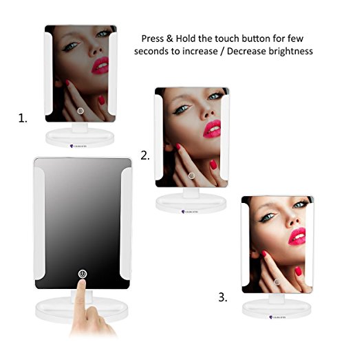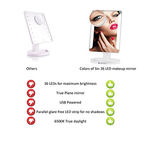 - BRIGHTEST MAKEUP MIRROR : Built-in 36 adjustable LED lights provide bright daylight without any glare in dark or poorly lit areas. Can be used with 4AA batteries(not included) or USB cable (included).