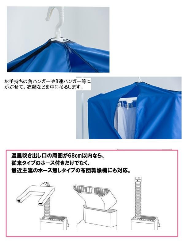 洗濯物が乾きにくい雨の日や冬も布団乾燥機でスピード乾燥。毎日使う子どもの部活動の衣類も短時間で乾燥でき、見られたくない下着類の乾燥にも役立ちます。花粉や黄砂が気になる時にも室内乾燥なので安心です。温風吹き出し口の周囲が68cm以内なら従来タイプのホース付きだけでなく、最近主流のホース無しタイプの布団乾燥機にも対応します。 |