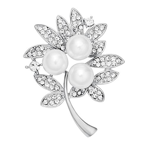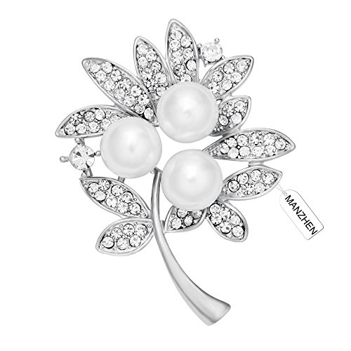 MANZHEN Christmas Gift Clear Crystal Rhinestone Simulated Pearl Leaf Brooch Pins Women Fashion Jewelry (Silver)