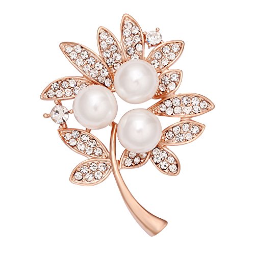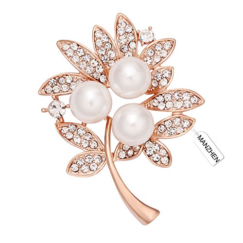 MANZHEN Christmas Gift Clear Crystal Rhinestone Simulated Pearl Leaf Brooch Pins Women Fashion Jewelry (Rose gold)