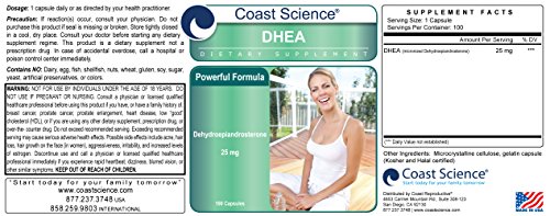 Coast Science®, DHEA contains 25 mg of pharmaceutical grade 99% pure DHEA (Dehydroepiandrosterone), the motherload of some 10 different steroid hormones associated with youth.† DHEA has demonstrated broad beneficial potential in the many detailed studies on prevention of age related diseases. The decline of DHEA levels in the body as we grow older is widely recognized. In males this decline starts in the early to mid twenties and a few years later in females.