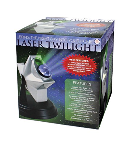 Bring the wonder of the night sky inside with the Can You Imagine Laser Twilight Projector. The laser projector projects the stunning panorama of a twilit sky onto the ceiling. The image slowly rotates over time, replicating the motion of the Earth. Two settings on the projector offer the choice of drifting clouds or a clear night sky for added variety. A four-hour shutoff feature conserves power and allows the projector to be used as a night-light if desired. Ideal for young space enthusiasts, especially those interested in astronomy. This is not a toy. Adult supervision required.Feature