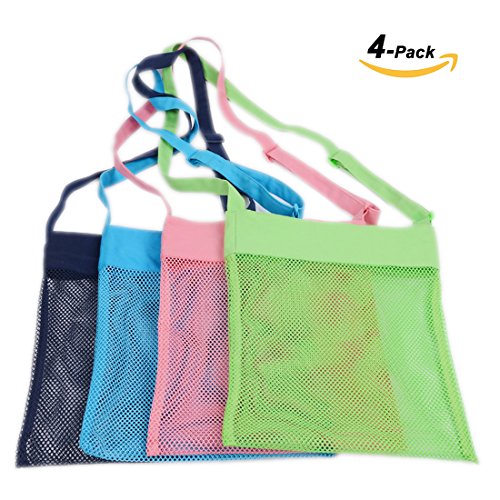 MoModer Colorful Mesh Beach Bags with Adjustable Carrying Straps for Kid's Shell Collection,Swimming Equipment and Toys Storage 4Pack(Blue,Pink,Green,and Navy Blue)