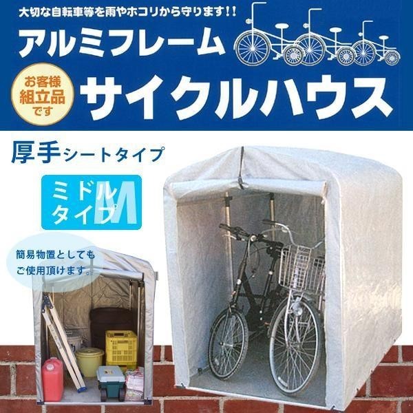 | 簡単組立のサイクルハウス。前幕はワンタッチバンドで簡単に固定できます。ゴムバンド使用でシート張りも簡単です。アルミフレームなので、持ち運びもラクラク♪簡易物置としても◎ |