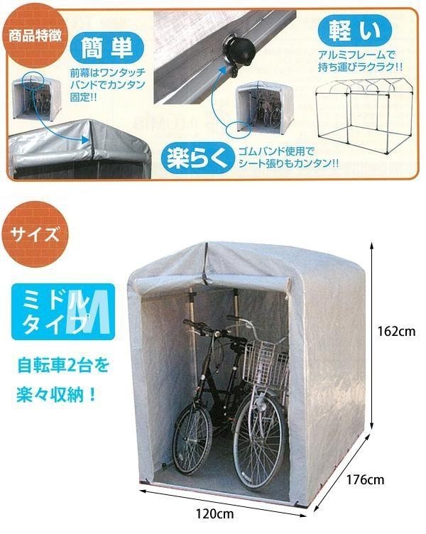 簡単組立のサイクルハウス。前幕はワンタッチバンドで簡単に固定できます。ゴムバンド使用でシート張りも簡単です。アルミフレームなので、持ち運びもラクラク♪簡易物置としても◎ |