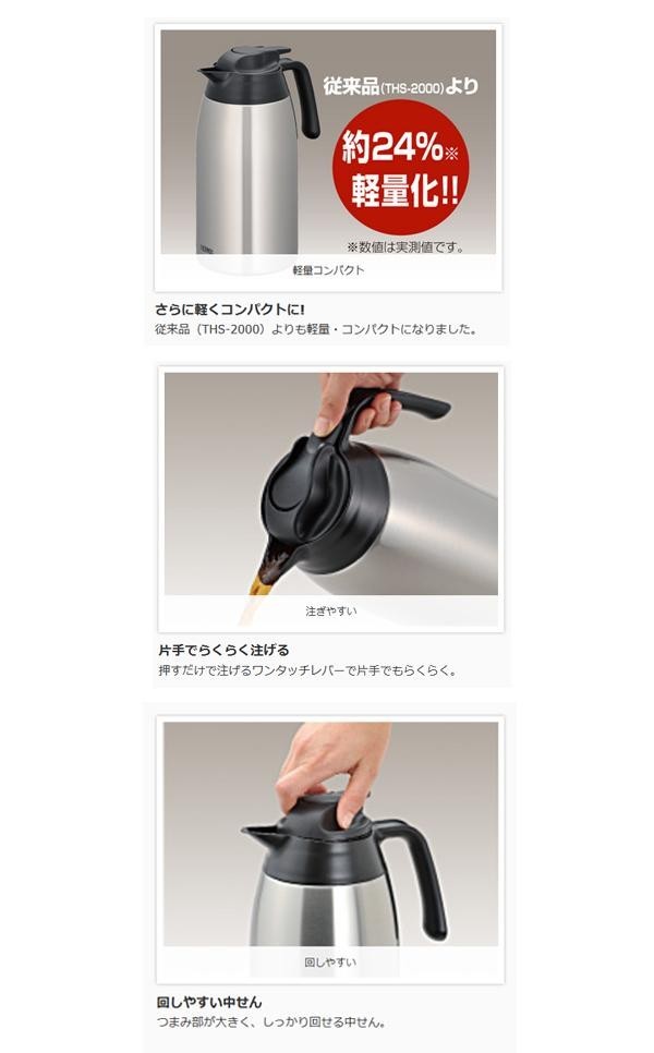 | ステンレス素材を生かしたシンプルなデザインのポットは、保温も保冷もでき、飲みものを最適の温度に保ちます。注ぎやすいワンタッチレバーの中せんと、丸洗いできる衛生的なステンレスボディ。ホットドリンクの保温はもちろん、約7cmの広口で氷も入れやすくアイスドリンクも。 |