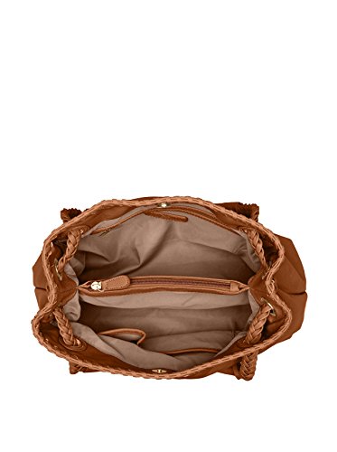 This sophisticated double top handle design features 1 Large interior zip; 1 Large interior zip top dividing compartment; 1 Medium interior slip; 1 Interior phone slip