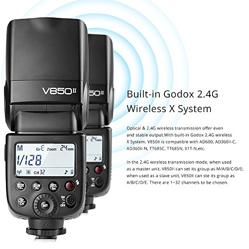 Upgraded from V850, V850II guarantees better light shooting experience with built-in Godox 2.4G wireless X system. With Master and Slave wireless flash system, V850II fits all DSLR camera brands e.g. Canon, Nikon, Pentax, Olympas, etc.