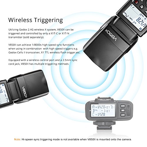 V850II can achieve 1/8000s high-speed sync when using in combination with high-speed triggers e.g. Godox Cells II transceiver, X1 TTL wireless flash trigger, etc. Note: High-speed sync triggering mode is not available when V850II is mounted onto the camera.
