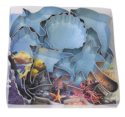 Set of 7 cookie cutters in assorted shapes and sizes - includes Dolphin 4.5", Shell 3", Palm Tree 3.75", Shark 4", Seahorse 5", Fish 3" and Seagull 4"