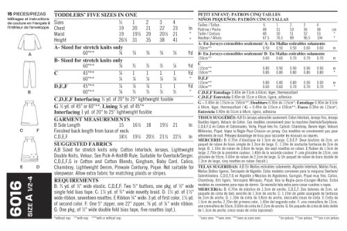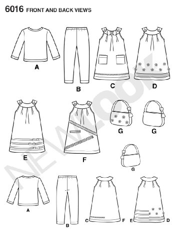 -. Feature : Toddler's Separates in size A (1/2-1-2-3-4), New Look Pattern #6016 / Number of looks included: 6 / Designed in UK, Manufactured in USA / Instructions are written in English, Spanish, and French / Sested fabrics: A,B Sized for stretch knits only: Cotton Interlock, Jerseys, Lightweight Double Knits, Velour; see Pick-A-Knit Rule; suitable for Overlock/Serger; C,D,E,F,G in Cotton and Cotton Blends, Gingham, Baby Cord, Calico, Chambray
