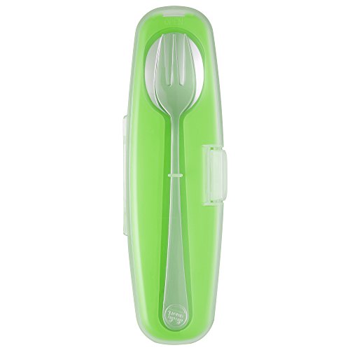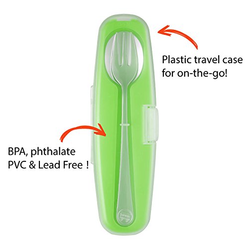 Innobaby Din Din Smart Stainless Steel Spoon and Fork with Carrying Case. Utensil Set for Kids and Toddlers. BPA free. Green.