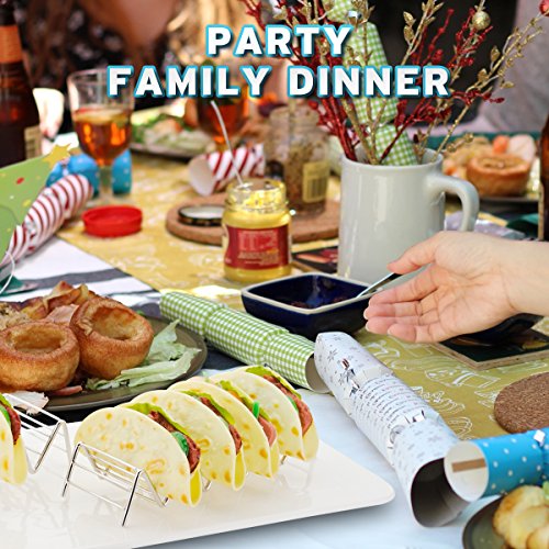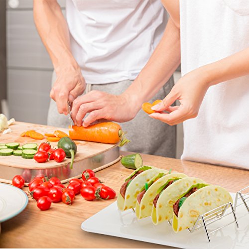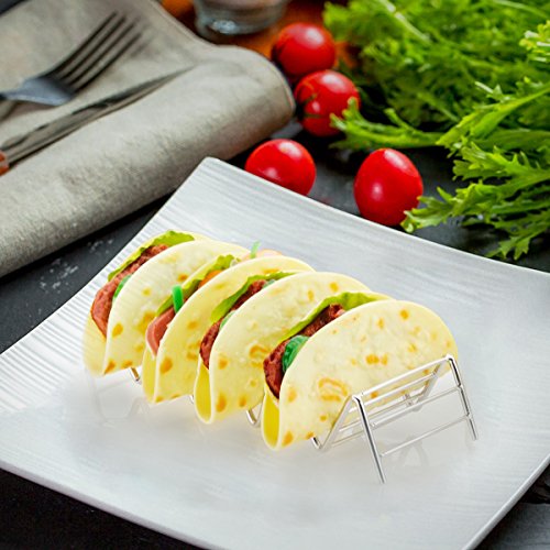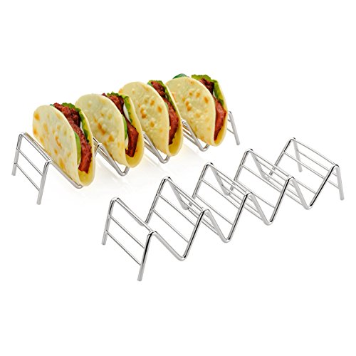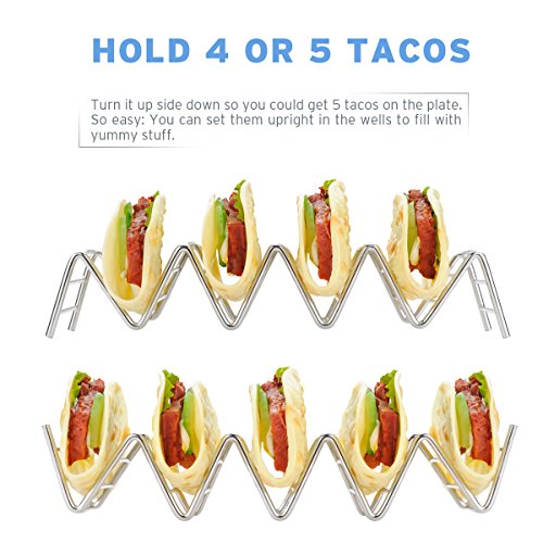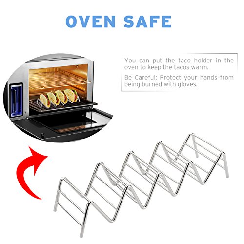 Product Features Makes making tacos so much easier: You can set them upright in the wells to fill with yummy stuff. Oven Safe: You can put the taco holder in the oven to keep the tacos warm. Set of 2: It can hold 4 or 5 tacos each, so you can eat TEN tacos at once without rebuilding.
