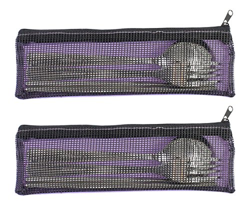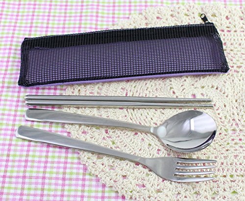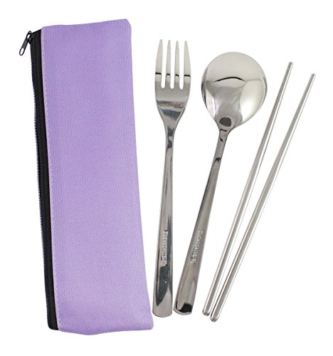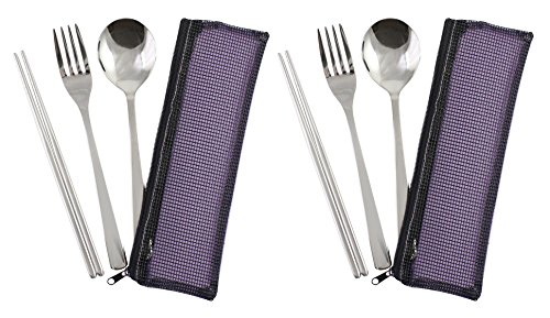 Travel Portable Compact Stainless Steel Chopsticks Fork Spoon Flatware Tableware Set with Case- Purple, Set of 2