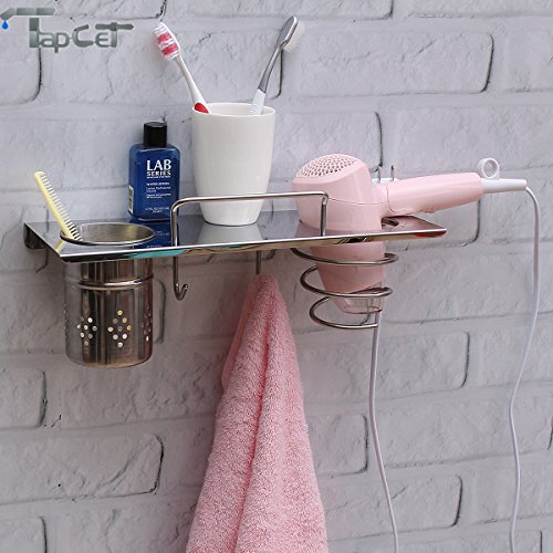 TAPCET Stainless Steel Chrome Bathroom Organizer Wall Mount Storge Organizer with Hair Dryer Holder Cylindrical Cup Towel Hooks Plug Holder for Bathroom Bedroom Washroom Barbershop Washroom Barbershop