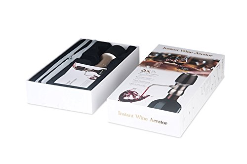 -. Feature : Instant Aeration:Experience luscious full-bodied drinks by simply attaching the tap to the bottle and pressing the button for instant aeration. With its dual infusion and suction system, it is able to fully oxidize and aerate your alcoholic beverage all at once / 6x More Surface Area Oxidation:The decanter provides 6 times more surface area oxidation than your average gravity-injected funnel, thus creating alcoholic drinks that are much smoother full-bodied, and flavorful / Perfect Pour:The decanter dispenses directly into your glass at a rate of 1.2 ounce every 2 seconds and immediately stops upon releasing the button for the perfect pour every time / Keeps Wine Fresh Longer:The decanter's airtight rubber seal prevents air from seeping into the bottle and keeps your wine fresh for longer periods of time / Easy Clean&Maintenance:With just the press and hold the button, draw clean water through the aerator for easy maintenance