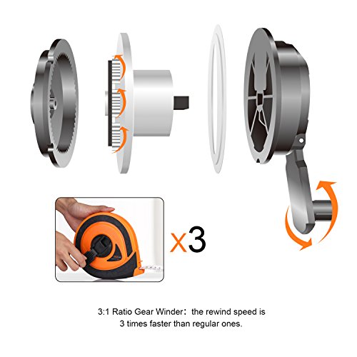 - ▲CONVENIENT FOLDING HANDLE AND HOOK - The manual handle with 3:1 ratio gear winder can retract tape 3 times faster than regular one. With an excellent hook, it can lock onto the hooked object for one person measurements and keep the tape measure compact