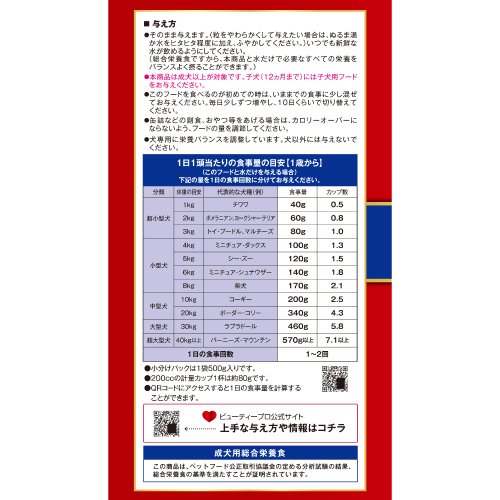 原材料:穀類(トウモロコシ、コーングルテンミール、小麦ブラン、小麦粉、ライスブラン)、肉類(チキンミール、チキンレバーパウダー)、油脂類(動物性油脂、植物性油脂、共役リノール酸、γ-リノレン酸(オメガ-6脂肪酸))、魚介類(フィッシュエキスパウダー、マリンコラーゲン、小魚粉末(DHA、EPA/オメガ-3脂肪酸源))、ビール酵母(β-グルカン源)、糖類(オリゴ糖、エリスリトール)、カゼインホスホペプチド、果実類(クランベリーパウダー、ブルーベリーパウダー(アントシアニン源))、トマト(リコピン源)、L-カルニチン、ミネラル類(カルシウム、リン、カリウム、ナトリウム、クロライド、鉄、銅、マンガン、グルコン酸亜鉛、硫酸亜鉛、ヨウ素、コバルト)、ビタミン類(A、B2、B6、B12、D、E、パントテン酸、コリン)、バチルスサブチルス(活性菌)、酸化防止剤(ミックストコフェロール、ローズマリー抽出物)、アミノ酸類(アルギニン、タウリン、メチオニン)、グルコサミン、コンドロイチン、ヒアルロン酸