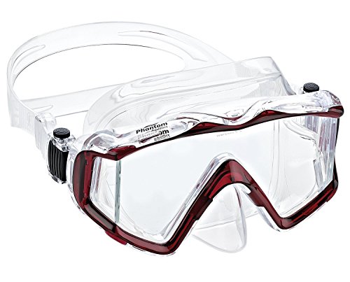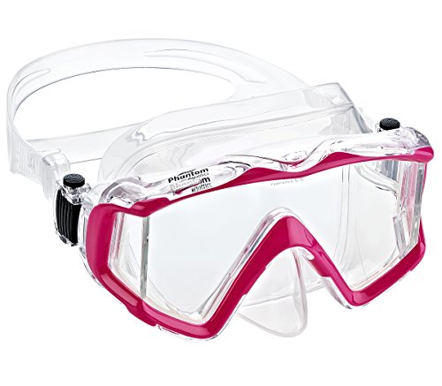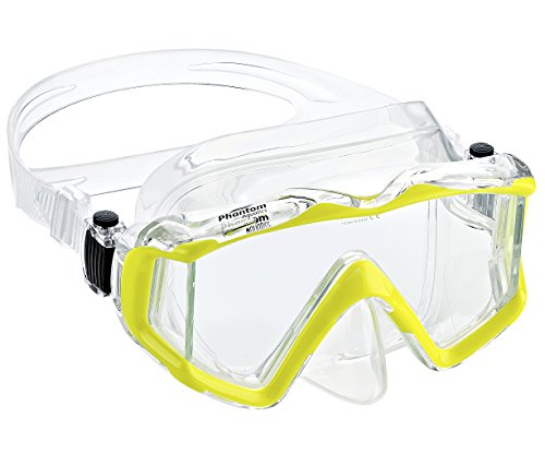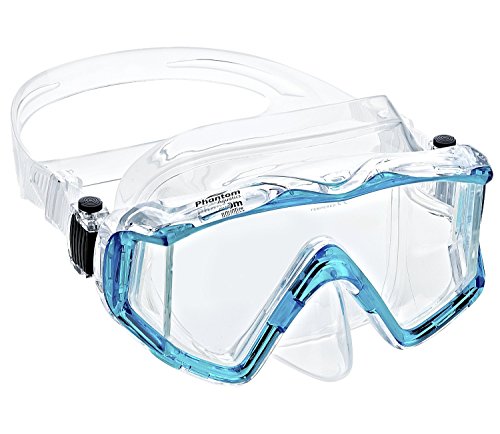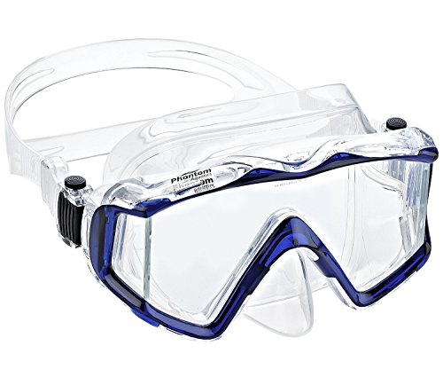 Phantom Aquatic's Panoramic 3-window Mask Patented Tri-Window Design has Seamless Side Windows for an Unobstructed View. With its Revolutionary Push-Button Buckle for Easy and Quick Strap Adjustments, with Foldable and Flexible Buckle Attachment that Swivel with Facial Movement ensures a great Seal Regardless of the Diving Conditions. The Trio C Mask is a Low Volume Mask with a Double Feathered Edge Silicone Skirt and Wide Split Strap that combine for a perfect Fit on the Face. The Mask places the Lenses Closer to your Face providing a Superior Field of View.