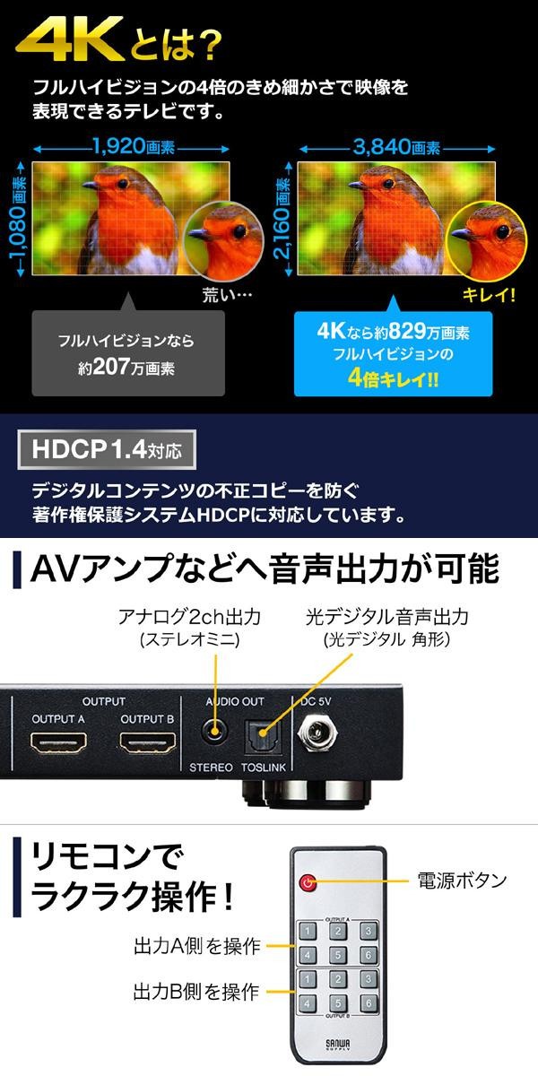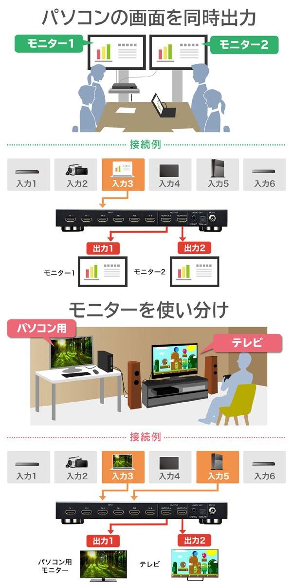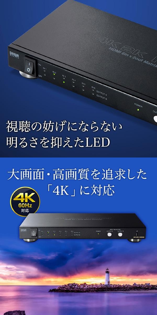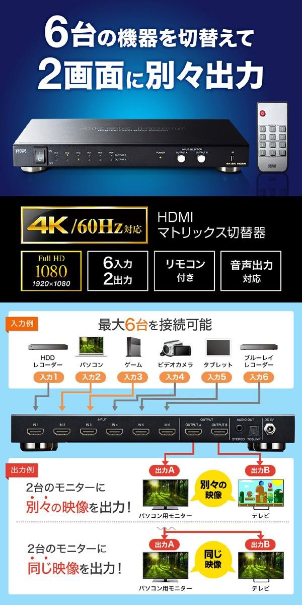 HDMI機器6台の映像・音声を切り替えて、2台のテレビやプロジェクターなどにマトリックス切り替え分配出力できるHDMI切替器です。